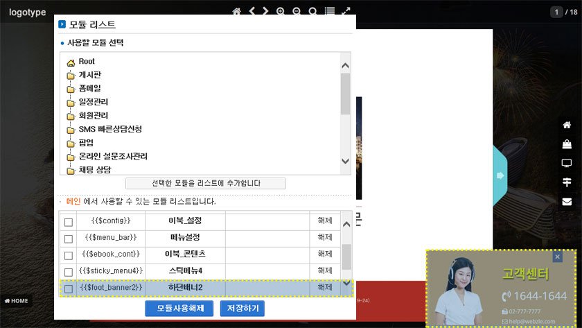 이북 페이지 환경설정소스 수정 경로 : 관리자 > 디자인관리 > 템플릿 디자인관리 > 모듈 > 공통모듈 > 이북_설정