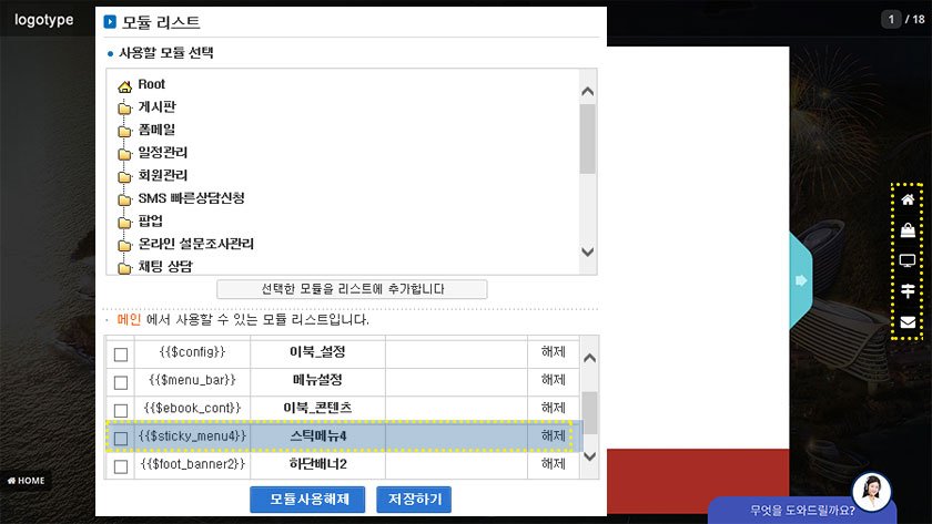 아래 모듈리스트에서 스틱메뉴5 모듈 ({{$sticky_menu4}}) 해제 후 저장